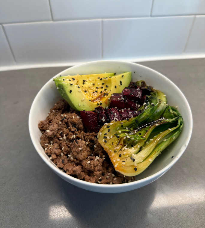 Assemble bowls with the cooked beef, bok choy, roasted beets and fresh avocado. Add cooked jasmine rice, brown rice or cauliflower rice, if desired.