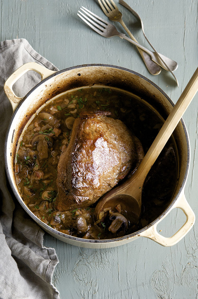 To Finish: Remove the roast and mushrooms to a bowl and set aside. Skim fat off the top or strain the broth into a jug to remove even more of the fat. Bring the broth to a simmer.