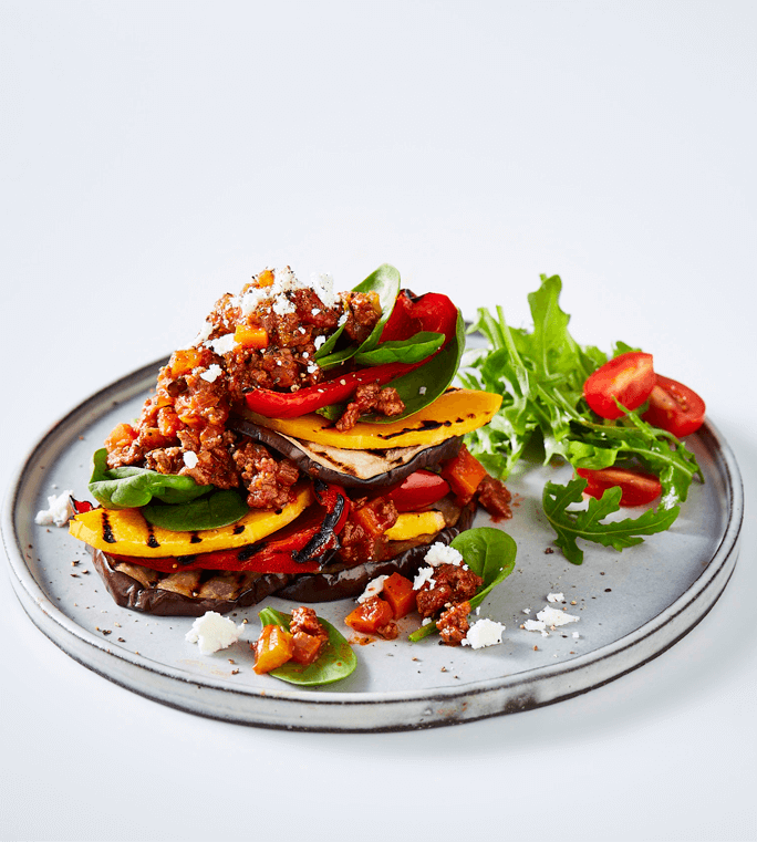 On serving plates layer char-grilled vegetables, baby spinach and beef Bolognese to create a stack. Top with feta, season with ground pepper and serve with baby arugula, cherry tomatoes and wholegrain bread roll or wrap.
