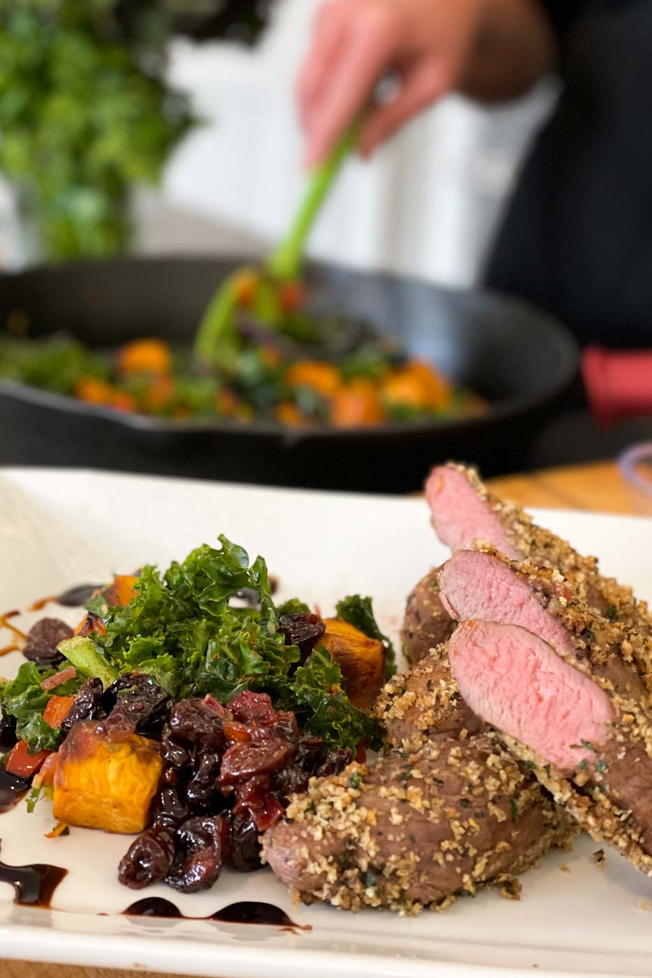 • To plate, mound Roasted Sweet Potato and Kale Hash onto plate. Slice the lamb 1/2 inch thick and serve with the hash, making sure to scoop up any crust that falls off the lamb and scatter it over each serving. Drizzle a bit of sauce around the plate, and garnish with fresh herbs or microgreens