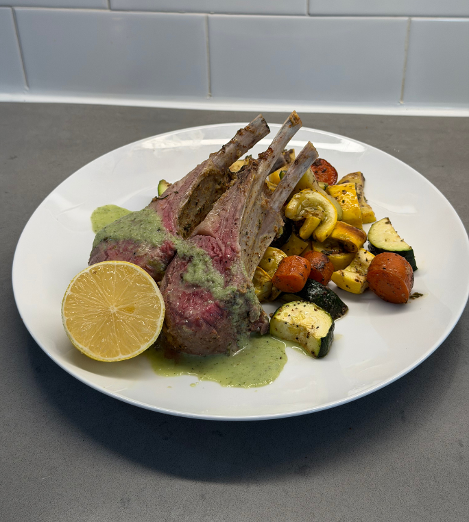 Roast: Place the lamb on top of the vegetables. Roast for 20–30 minutes, or until the lamb reaches 135°F for medium-rare (adjust time for your preferred doneness) and the vegetables are tender and caramelized.